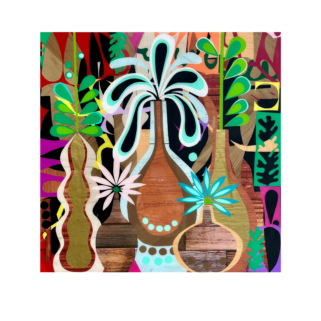 MidMod Garden features hand-cut vinyl vases with wood-grain textures, layered in resin. Each holds vibrant, stylized flowers outlined in neutral tones, blending mid-century modern geometry with playful organic shapes on a multicolored background.