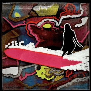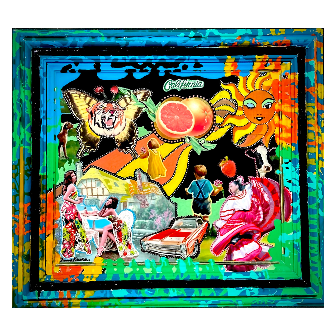 This mixed media creation incorporates a vintage painting, media clippings, and acrylic in a hand painted frame, which becomes part of the painting.