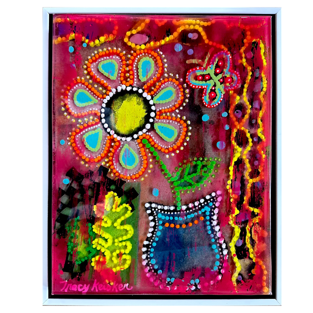 Layers of plexiglass, acrylic, resin on wooden panel. Each layer of glass is painted, giving this piece a tactile and 3D experience.