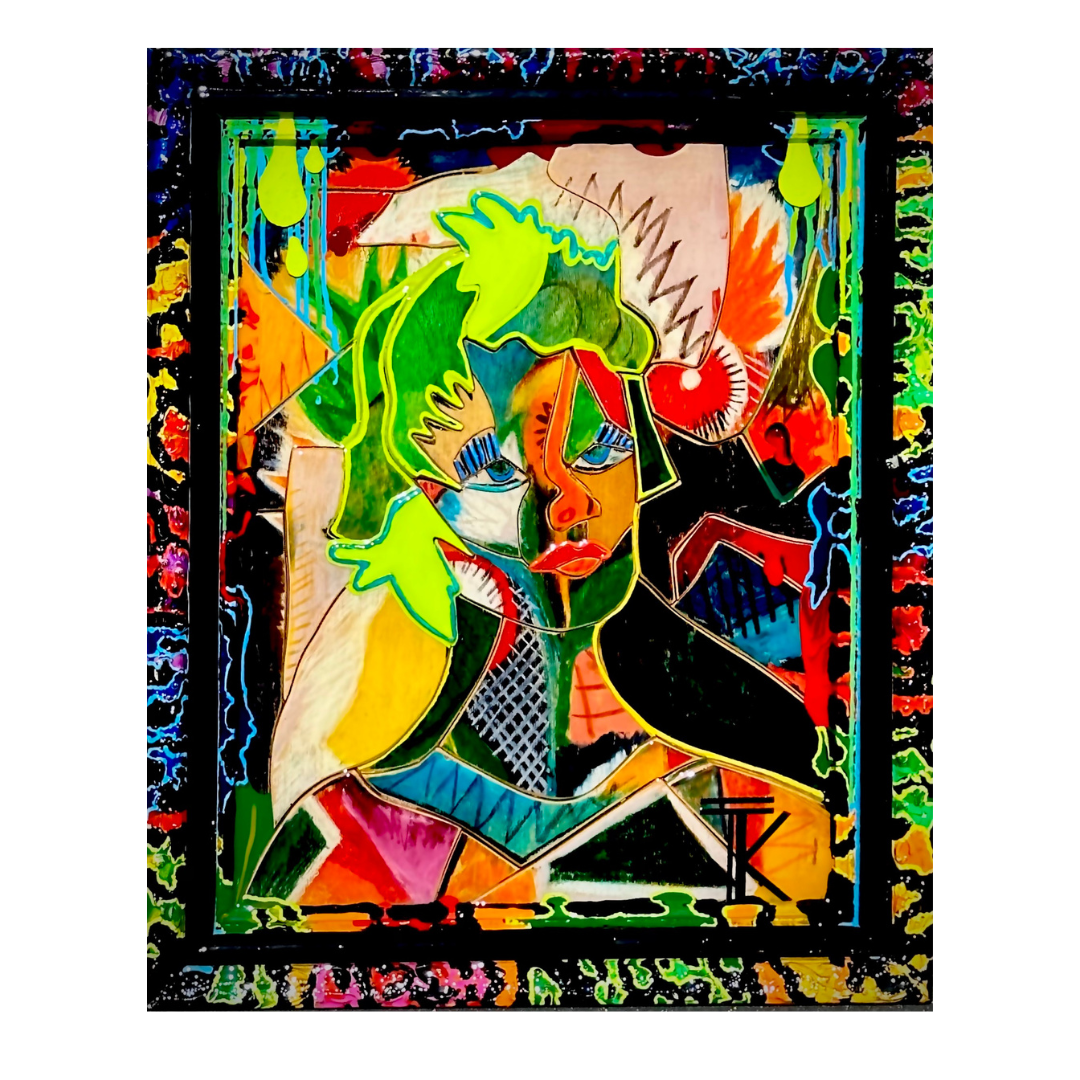 La Ferna originated from my Great Uncle Otto’s sketchbook. She is a bas-relief created with wood, painted with pastel and acrylic. The hand painted frame is part of the artwork. Coats of resin add the finishing touch. This piece won first place at the San Clemente Art Gallery in 2024.