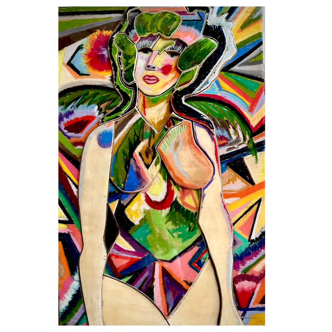 Lillian began as a sketch from my Great Uncle Otto’s sketchbook, circa 1930’s. She stands in her everlasting pose, gazing into the distance. She is painted with pastels on wood, then cut and carved to create a bas-relief. This 2-D sculpture is completed with a resin glaze.