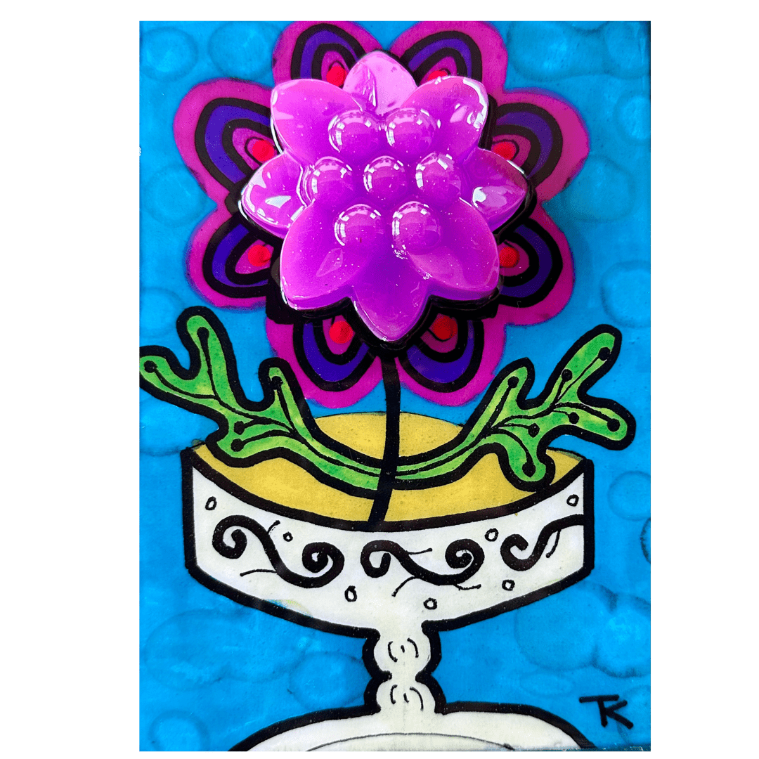 This captivating piece of art features a beautifully crafted purple resin flower that stands out against a vibrant, hand-painted paper background. The flower, with its intricate petal design and glossy finish, is a striking centerpiece, exuding a sense of elegance and charm. Set within a golden chalice adorned with ornate details, the flower is complemented by lush green leaves that add a touch of nature’s serenity. The entire artwork is sealed with a layer of resin, enhancing the vivid colors and providing a sleek, polished finish. Ideal for bringing a touch of sophistication and color to any room.