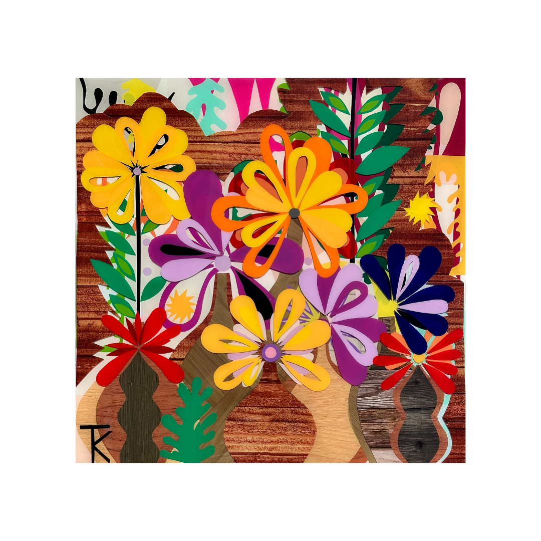 Sunlit Florals features bold, looped petals in vivid yellows, oranges, and purples layered with green leaves. Textured woodgrain backgrounds and colorful vinyl and resin create a rich, modern floral composition inspired by childhood patterns.