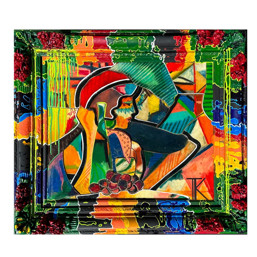 Seated with a bottle of wine, wearing a sassy red beret, contentedly looking into the distance, perhaps she is waiting for her lover. She is carved with layers of hardwood plywood creating a bass-relief. The frame is painted to become part of the sculpture. The piece is encased in resin.
